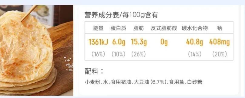 很多“0 反式脂肪酸”的食品,比如某款手抓饼,虽然标有“0 反式脂肪酸”,但总脂肪含量有 15.3%,脂肪并不少。