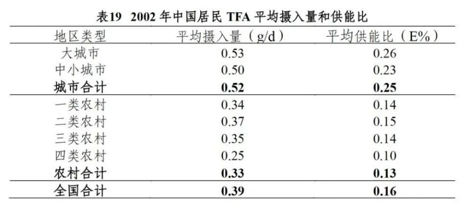 调查显示,中国人平均每天吃的反式脂肪是 0.39 克,相当于供能比为 0.16%,城里人比农村人吃得多一些,平均供能比是 0.25%,在北京、广州这种高端大气上档次的城市,反式脂肪的供能比也只有 0.34%,远低于 WHO 的建议值。
